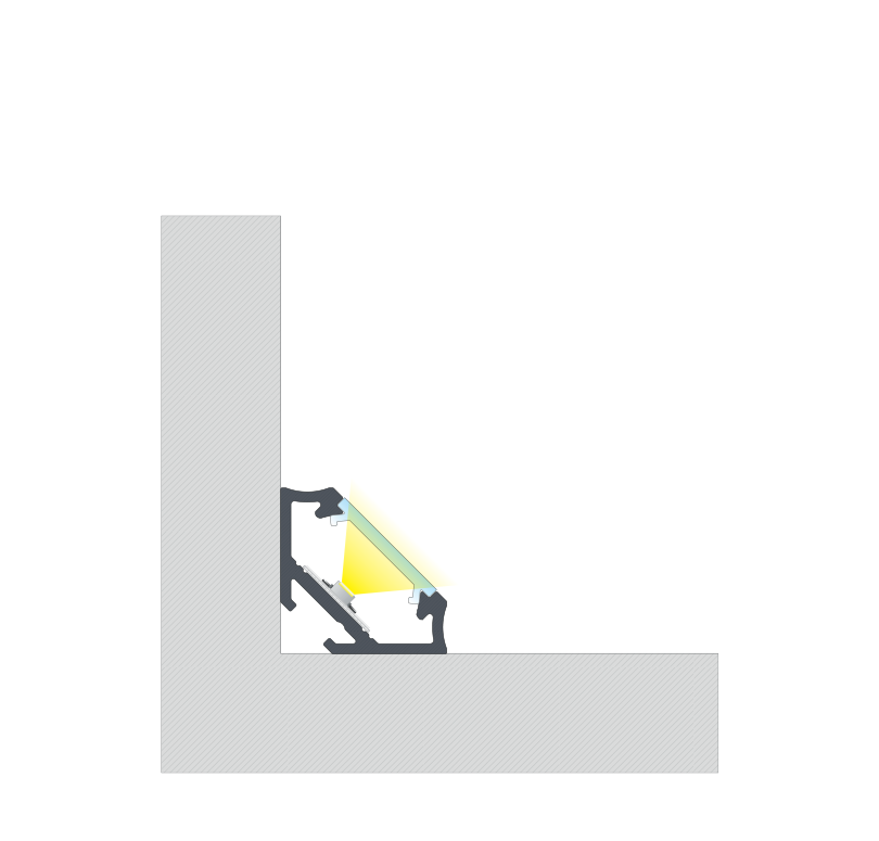 Świetnie nadający się do designerskich połączeń dwóch prostopadłych powierzchni oraz wszędzie tam, gdzie konieczne jest skierowanie światła wychodzącego z profilu pod kątem 45 stopni.