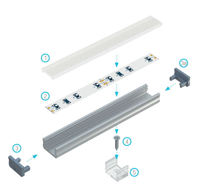 Schemat złożenia elementów systemu oświetleniowego z wykorzystaniem profilu oraz: (1) klosza BASIC, (2) taśmy LED, (3) zaślepki z otworem, (3a) zaślepki bez otworu, (4) wkrętu montażowego, (5) uchwytu montażowego A MINI.